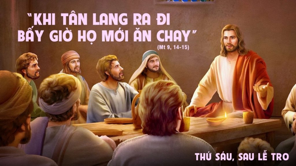 Đức Giêsu trả lời: “Chẳng lẽ khách dự tiệc cưới lại có thể than khóc, khi chàng rể còn ở với họ? Nhưng khi tới ngày chàng rể bị đem đi rồi, bấy giờ họ mới ăn chay”….