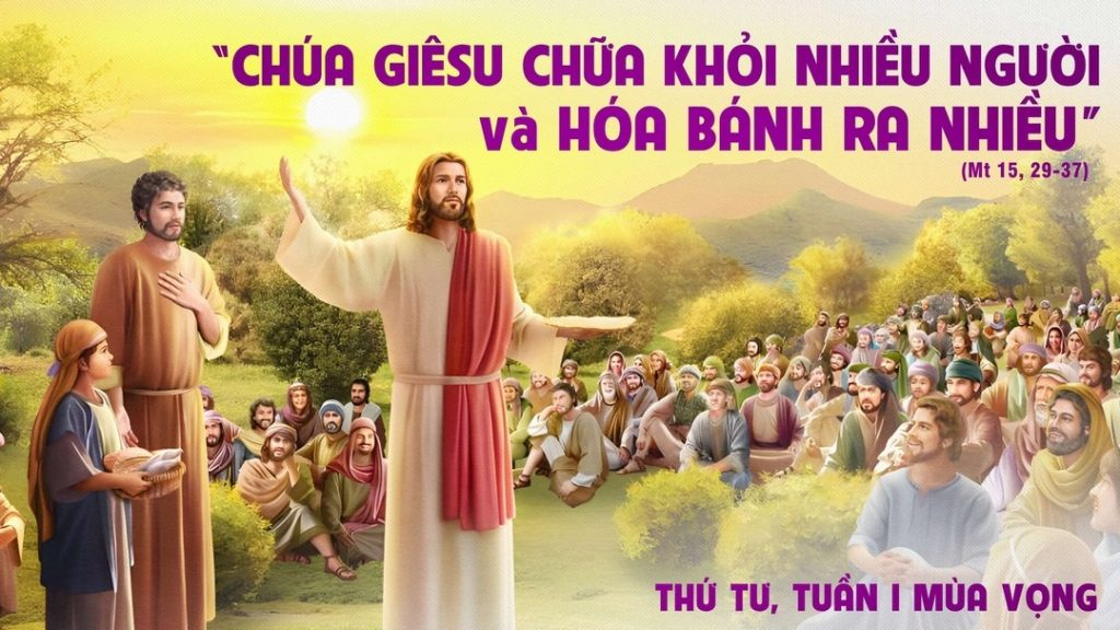 Người cầm lấy bảy cái bánh và mấy con cá, dâng lời tạ ơn, bẻ ra, trao cho môn đệ, và môn đệ trao cho đám đông. Ai nấy đều ăn và được no nê. …