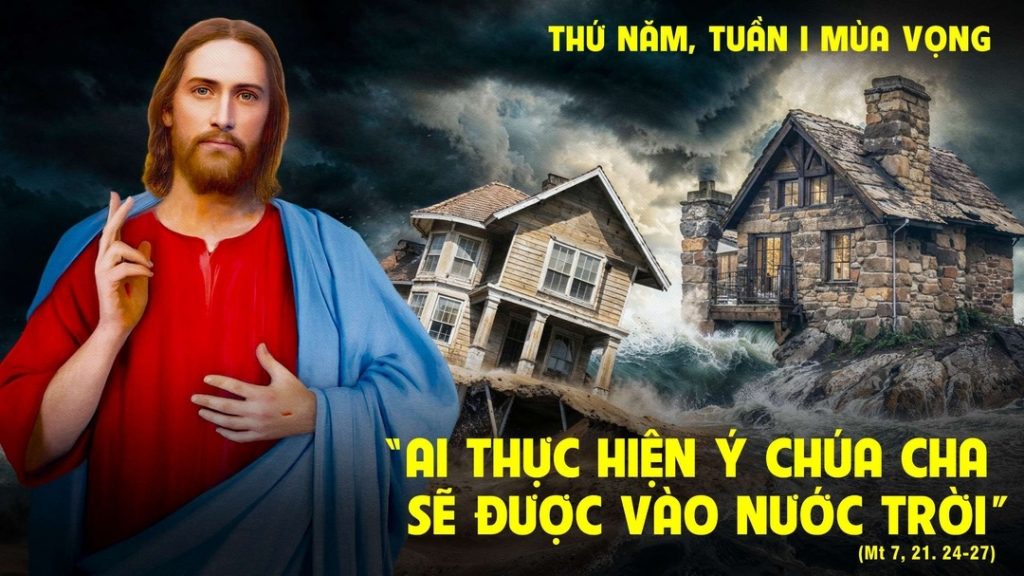 ….chỉ ai thi hành ý muốn của Cha Thầy là Đấng ngự trên trời, mới được vào mà thôi. Vậy ai nghe những lời Thầy nói đây mà đem ra thực hành, thì ví được như người khôn xây nhà trên đá….