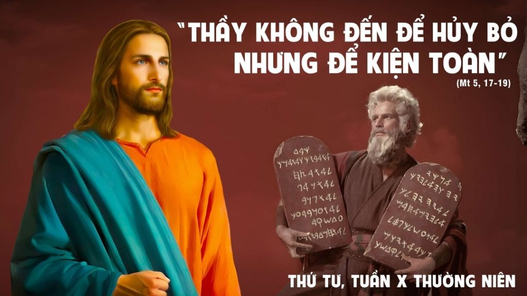 Đức Giêsu nói với các môn đệ rằng: “Anh em đừng tưởng Thầy đến để bãi bỏ Luật Mô-sê hoặc lời các ngôn sứ. Thầy đến không phải là để bãi bỏ, nhưng là để kiện toàn….
