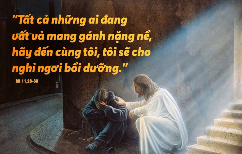 “Tất cả những ai đang vất vả mang gánh nặng nề, hãy đến cùng tôi, tôi sẽ cho nghỉ ngơi bồi dưỡng. Anh em hãy mang lấy ách của tôi,….