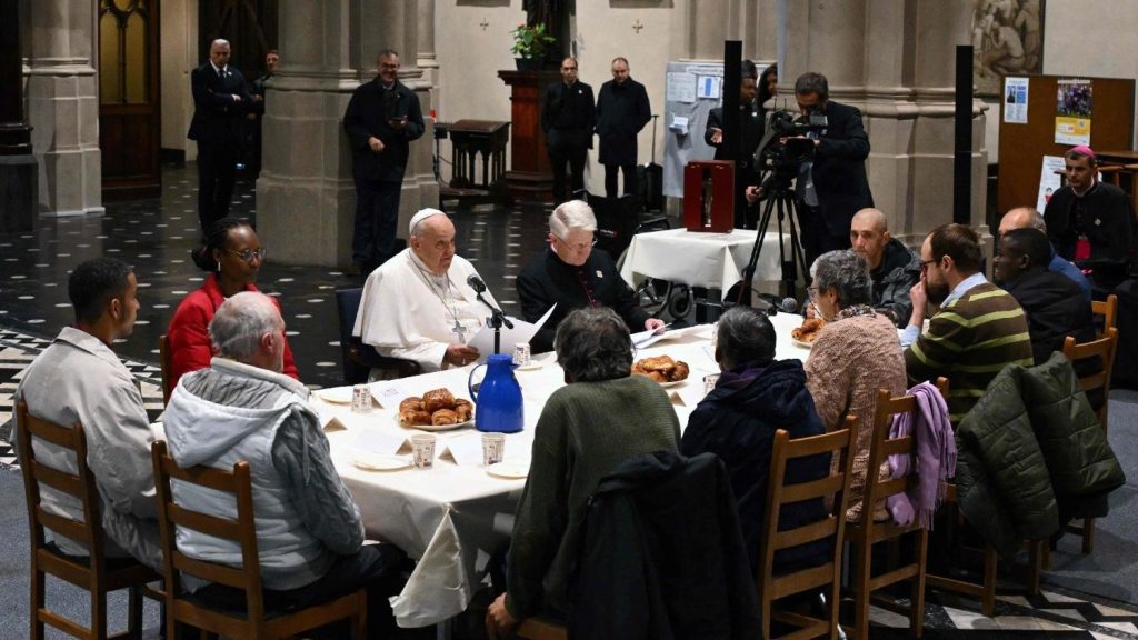 Đức Giáo hoàng Phanxicô dùng bữa sáng với người vô gia cư tại giáo xứ Thánh Gilles, Brussels – Bỉ, ngày 28.09.2024 (AFP or licensors)