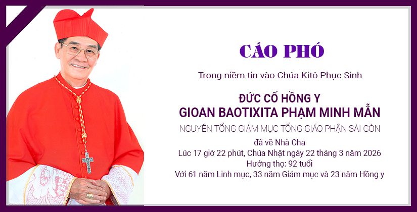 Theo thông tin từ Tòa Tổng Giám mục Tổng Giáo phận Sài Gòn, Đức Hồng Y Gioan Baotixita Phạm Minh Mẫn đã kết thúc hành trình dương thế lúc 17g25 ngày 22/03/2026 tại Trung tâm Mục vụ Tổng Giáo phận Sài Gòn, hưởng thọ 92 tuổi, với 61 năm linh mục, 33 năm giám mục.