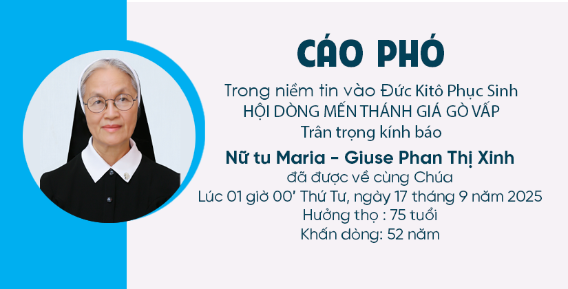 Chúng con kính xin Đức Cha Giuse – Tổng Giám mục Tổng Giáo phận Sài Gòn, quý Đức Hồng Y, quý Đức Tổng, quý Đức Cha, quý Cha, quý Bề Trên, quý Chị Tổng Phụ Trách các Hội dòng Mến Thánh Giá, quý Tu sĩ và quý vị thương cầu nguyện cho linh hồn MARIA-GIUSE – người chị em của chúng con sớm được hưởng Nhan Thánh Chúa.