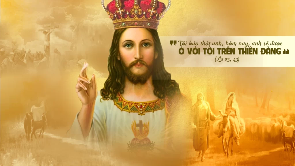 Bản văn Tin mừng trong ngày lễ Chúa Kitô- Vua Vũ Trụ năm C dẫn chúng ta trở lại với bầu khí của ngày thứ Sáu Tuần Thánh. Bản văn biểu tỏ cho chúng ta thấy, đây không phải là một khung cảnh hoàn tráng, lộng lẫy, binh hùng, kỵ sỹ cho một lễ suy tôn một người làm Vua. Bầu khí và khung cảnh trái ngược với suy nghĩ của con người. Một bầu khí bao trùm tử khí. Những lời tôn vinh là những lời sỉ nhục; những lời hoan hô là những lời trách móc, hờn dỗi, thách đố; những nụ cười là sự ngạo mạn, ngạo ngược…. của những kinh sư, lính tránh và cả kẻ trộm. Rượu mừng là giấm chua.