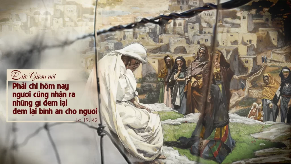 Và trong bài Tin mừng, Chúa Giêsu cho các môn đệ biết rõ những khốn khổ sẽ xảy ra cho dân thành Giêrusalem, vì họ không nhận ra Người đến đem bình an thật sự cho họ. Vì sự thờ ơ của họ mà Chúa Giêsu đã khóc thương cho họ; khóc thương cho hậu quả sẽ xảy ra với thành này.