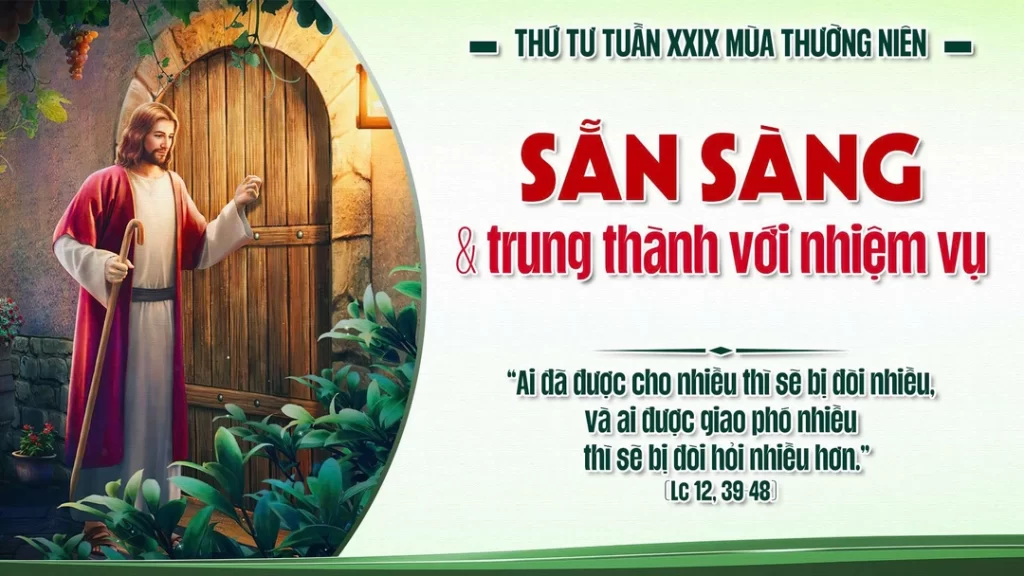 Khi ấy, Chúa Giêsu nói với các môn đệ: 39 Anh em hãy biết điều này: nếu chủ nhà biết giờ nào kẻ trộm đến, hẳn ông đã không để nó khoét vách nhà mình đâu.40 Anh em cũng vậy, hãy sẵn sàng, vì chính giờ phút anh em không ngờ, thì Con Người sẽ đến”. 41 Bấy giờ ông Phê-rô hỏi: “Lạy Chúa, Chúa nói dụ ngôn này cho chúng con hay cho tất cả mọi người?” 42 Chúa đáp: “Vậy thì ai là người quản gia trung tín, khôn ngoan, mà ông chủ sẽ đặt lên coi sóc kẻ ăn người ở, để cấp phát phần thóc gạo đúng giờ đúng lúc? 43 Khi chủ về mà thấy đầy tớ ấy đang làm như vậy, thì thật là phúc cho anh ta. 44 Thầy bảo thật anh em, ông sẽ đặt anh ta lên coi sóc tất cả tài sản của mình. 45 Nhưng nếu người đầy tớ ấy nghĩ bụng: “Chủ ta còn lâu mới về”, và bắt đầu đánh đập tôi trai tớ gái và chè chén say sưa, 46 chủ của tên đầy tớ ấy sẽ đến vào ngày hắn không ngờ, vào giờ hắn không biết, và ông sẽ loại hắn ra, bắt phải chung số phận với những tên thất tín. 47 “Đầy tớ nào đã biết ý chủ mà không chuẩn bị sẵn sàng, hoặc không làm theo ý chủ, thì sẽ bị đòn nhiều. 48 Còn kẻ không biết ý chủ mà làm những chuyện đáng phạt, thì sẽ bị đòn ít. Hễ ai đã được cho nhiều thì sẽ bị đòi nhiều, và ai được giao phó nhiều thì sẽ bị đòi hỏi nhiều hơn.